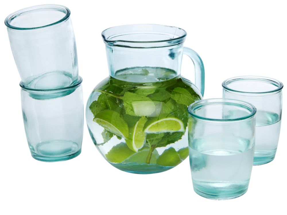 Набор из 5 предметов из переработанного стекла, в который входят один кувшин на 2,3 литра и четыре стакана на 430 мл. Для создания этого набора было использовано 5 стеклянных бутылок. Переработанное стекло не отличается ничем по качеству от обычного, но при этом является более экологичным, ведь на изготовление этого материала тратится меньше энергии, сырья и примесей.