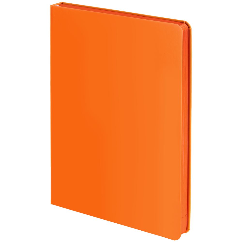 Ежедневник с твердой обложкой и тонированным обрезом, выполнен из материала Soft Touch, оранжевый ОО, дополнен ляссе в цвет обложки.