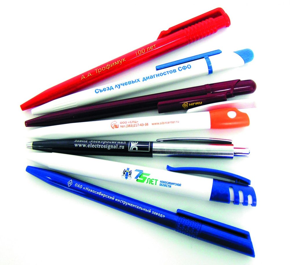 Должны соответствовать особенностям переносимого изображения. Красный логотип будет хорошо смотреться на белом фоне. Для более крупных надписей понадобятся ручки большего диаметра. Изделия с широкими клипами можно использовать для раздельного нанесения, например логотипа на поверхность ручки и надписи-слогана на клип.